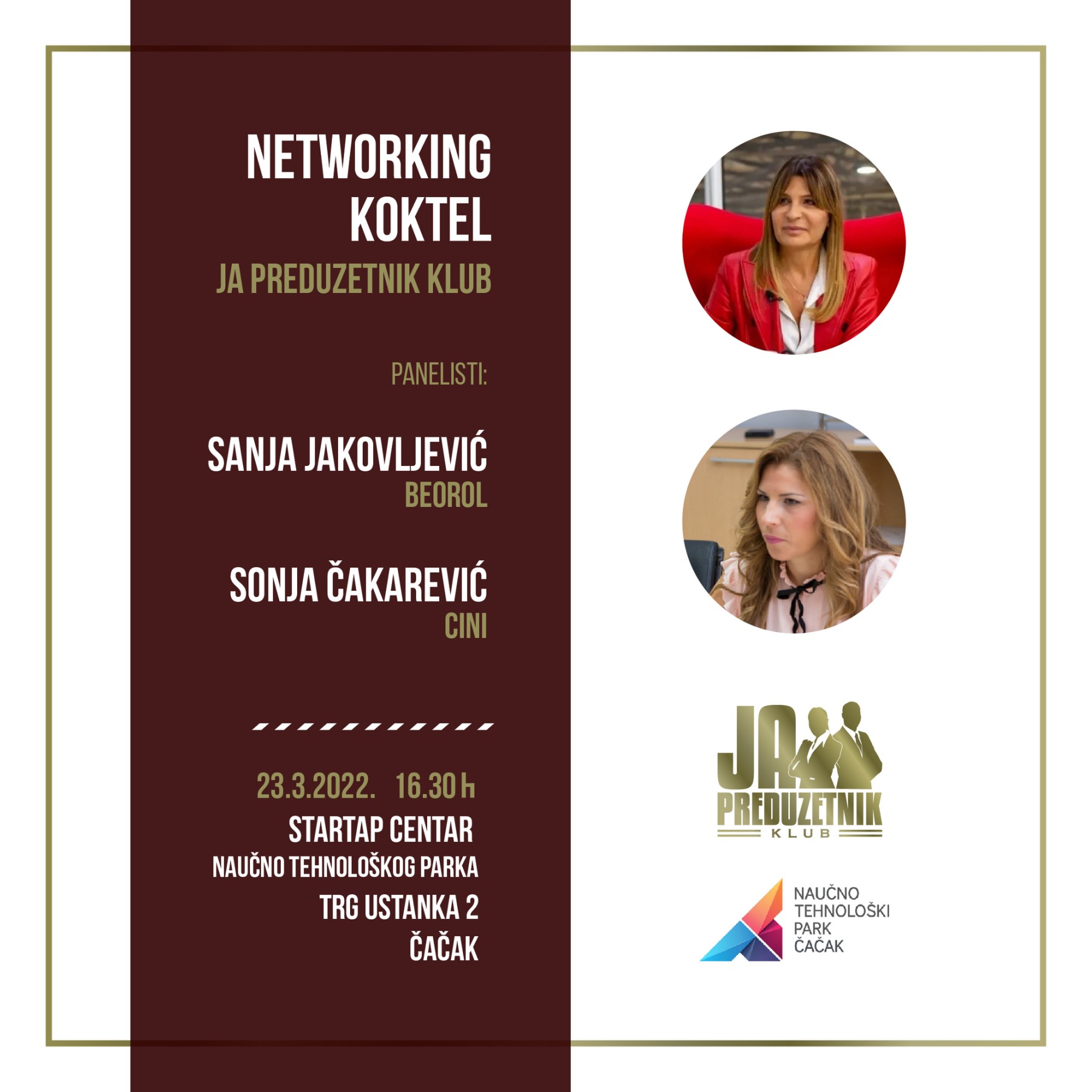 Novo okupljanje Ja, Preduzetnik Kluba koje će se održati 23.03.2022. od 16:30 u Startup centru Naučno-tehnološkog parka (Trg ustanka 2, Čačak). Gosti ovog koktela su