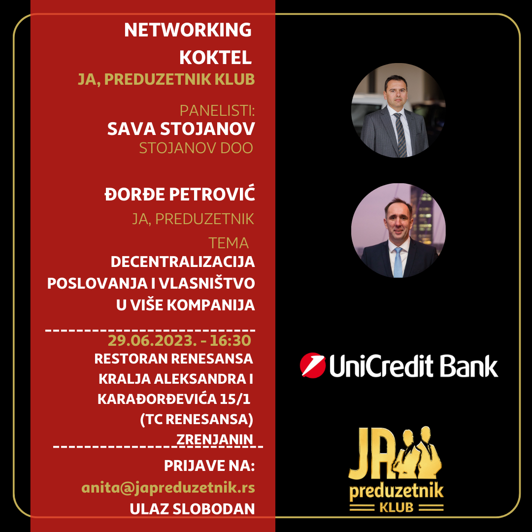 JUNSKI NETWORKING KOKTEL 29.06.2023 16:30 RESTORAN RENESANSA, KRALJA ALEKSANDRA I KARAĐORĐEVIĆA 15/1 (TC RENESANSA), ZRENJANIN Na ovom susretu saznajte kako izgleda decentralizacija poslovanja, vlasništvo u