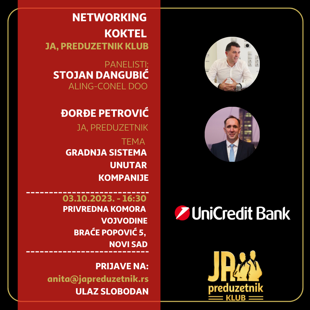 OKTOBARSKI NETWORKING KOKTEL 03.10.2023 16:30 PRIVREDNA KOMORA VOJVODINE; BRAĆE POPOVIĆ 5, NOVI SAD Na ovom susretu saznajte kako izgleda gradnja sistema unutar kompanije i još